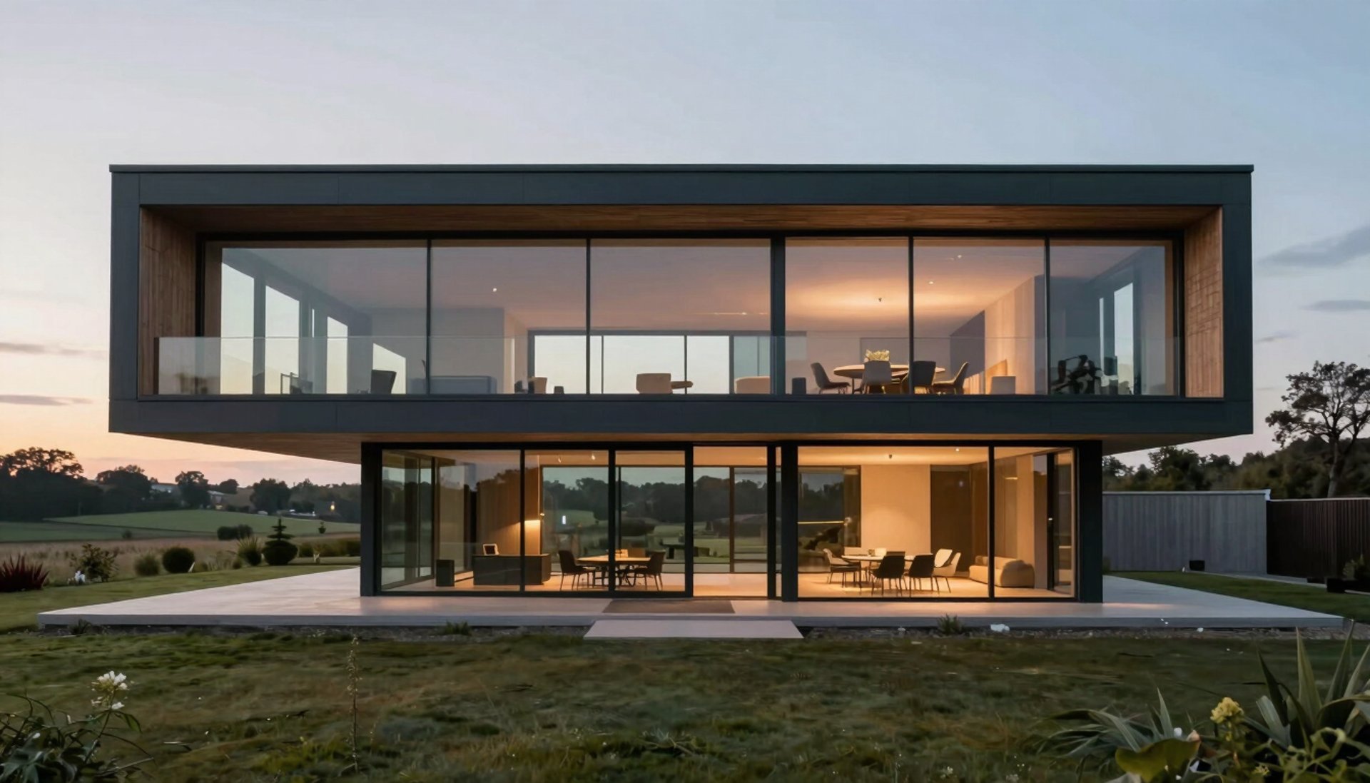 A high-end modern house exterior in Wallonia at dusk, with warm interior lighting glowing through large, elegant windows with warm natural wood frames. The atmosphere is sophisticated and serene.